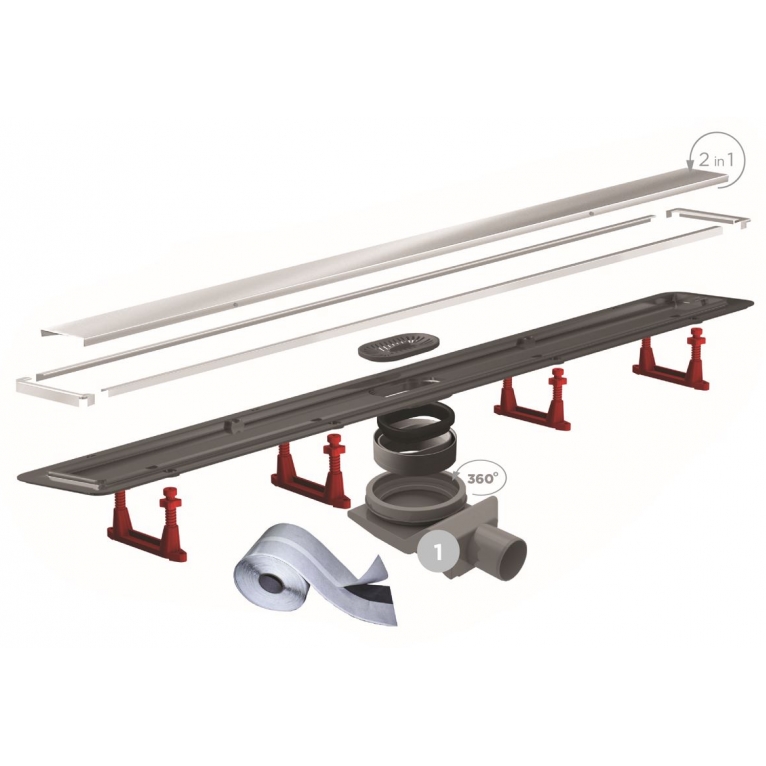 Canal de duche em ABS e redutor em Polipropileno, sem entradas laterais e com uma saída horizontal DN 50mm.